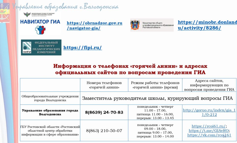 Управление образования города Волгодонска 8(8639) 24-70-83 понедельник - четверг