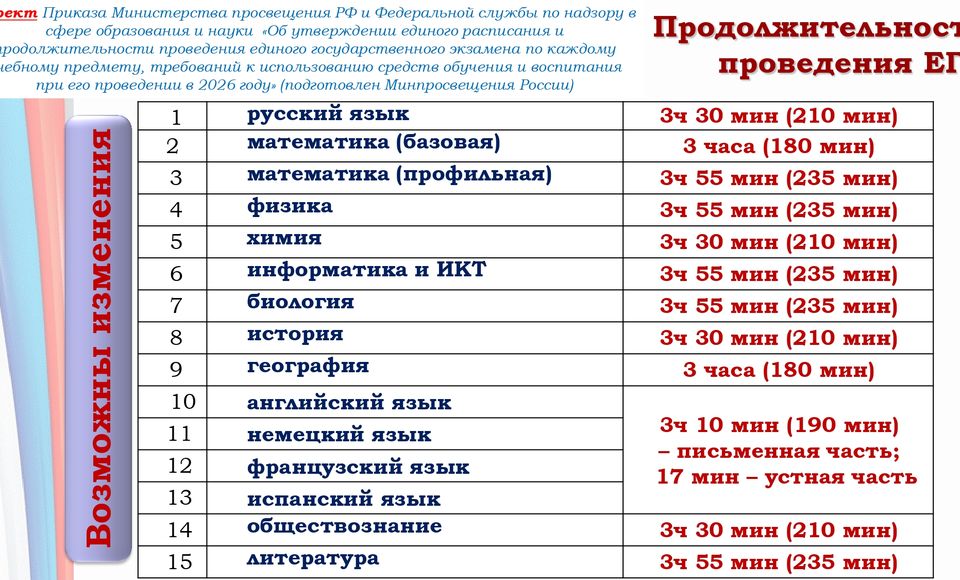 Для проведения ЕГЭ на территории Российской Федерации и за ее пределами предусматривается единое расписание экзаменов. По каждому учебному предмету устанавливается продолжительность проведения экзаменов.