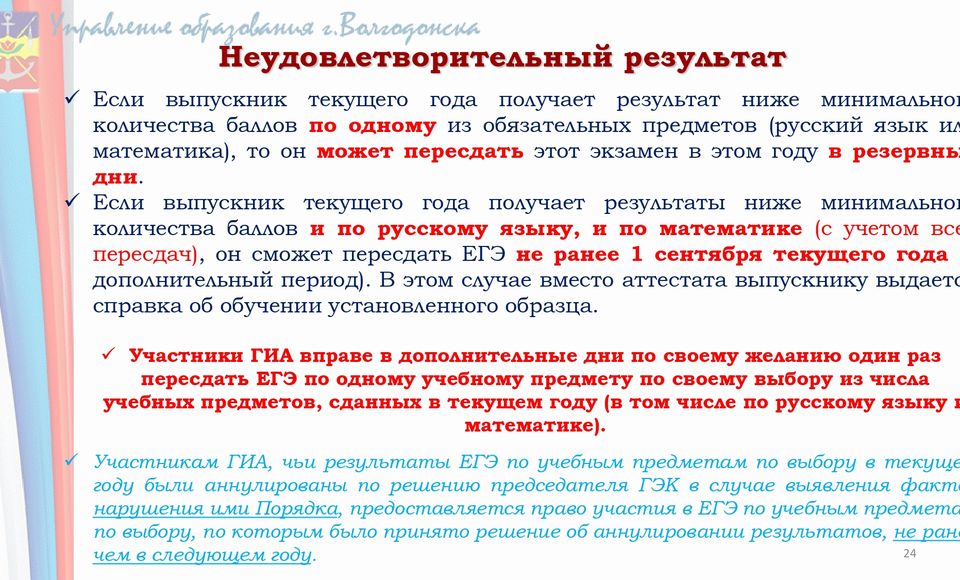 Если участник ЕГЭ (выпускник текущего года) получит результат ниже установленного минимального количества баллов по одному из обязательных учебных предметов, он имеет право на повторную сдачу в дополнительные сроки, предусмотренные единым расписанием.