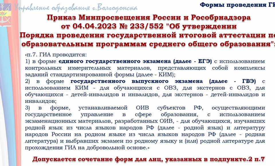 Государственная итоговая аттестация выпускников 11 классов проводится в форме Единого государственного экзамена (ЕГЭ) или в форме Государственного выпускного экзамена (ГВЭ) (для лиц с ограниченными возможностями здоровья).