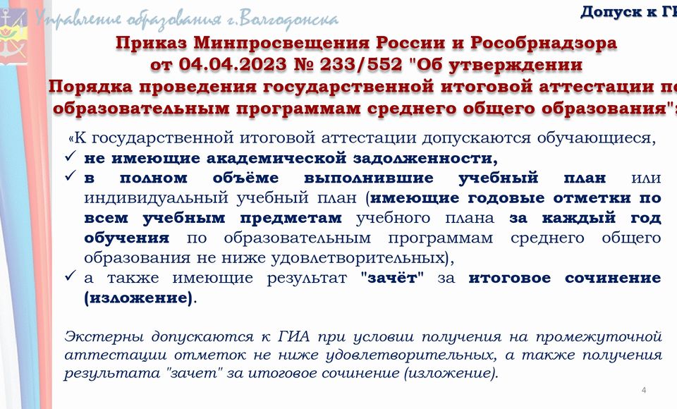 К ЕГЭ как форме ГИА допускаются обучающиеся, не имеющие академической задолженности, в том числе за итоговое сочинение (изложение), и в полном объеме выполнившие учебный план или индивидуальный учебный план (имеющие годовые отметки по всем учебным предметам учебного плана за каждый год обучения по образовательной программе среднего общего образования не ниже удовлетворительных).