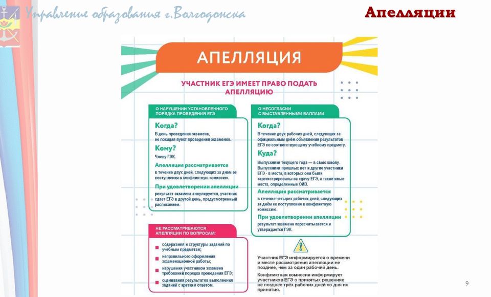 Апелляция о несогласии с выставленными баллами подается в течение двух рабочих дней после официального дня объявления результатов ГИА по соответствующему учебному предмету.