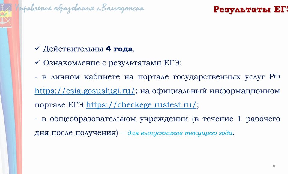 После утверждения результаты ЕГЭ в течение 1 рабочего дня передаются в образовательные организации, а также органы местного самоуправления, осуществляющие управление в сфере образования, учредителям и загранучреждениям для ознакомления обучающихся, выпускников прошлых лет с утвержденными председателем ГЭК результатами ЕГЭ.