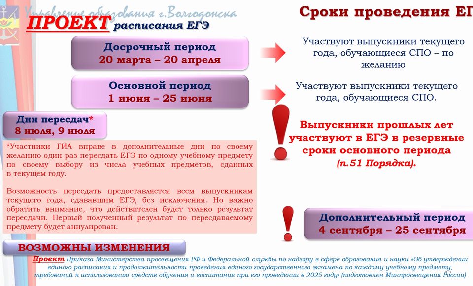 Для проведения ЕГЭ на территории Российской Федерации и за ее пределами предусматривается единое расписание экзаменов.