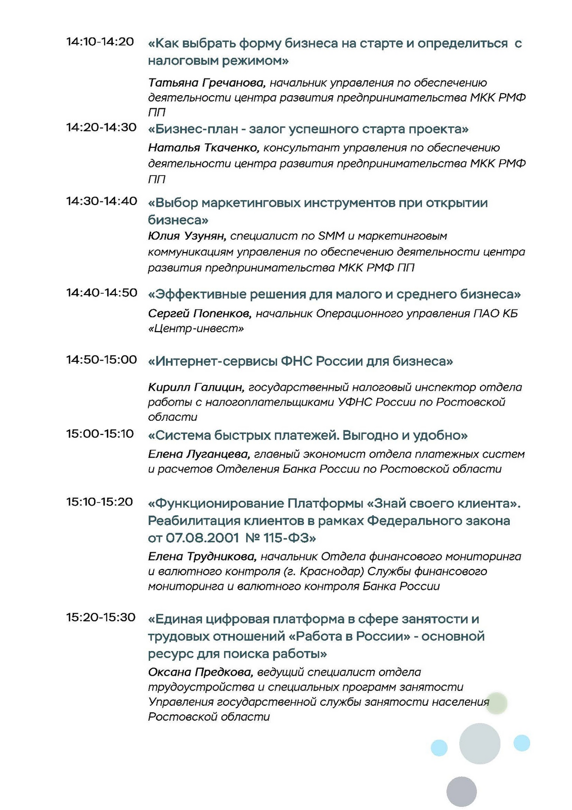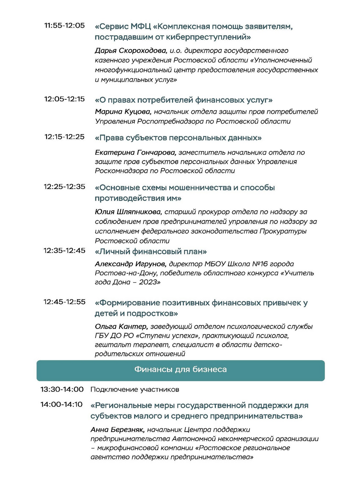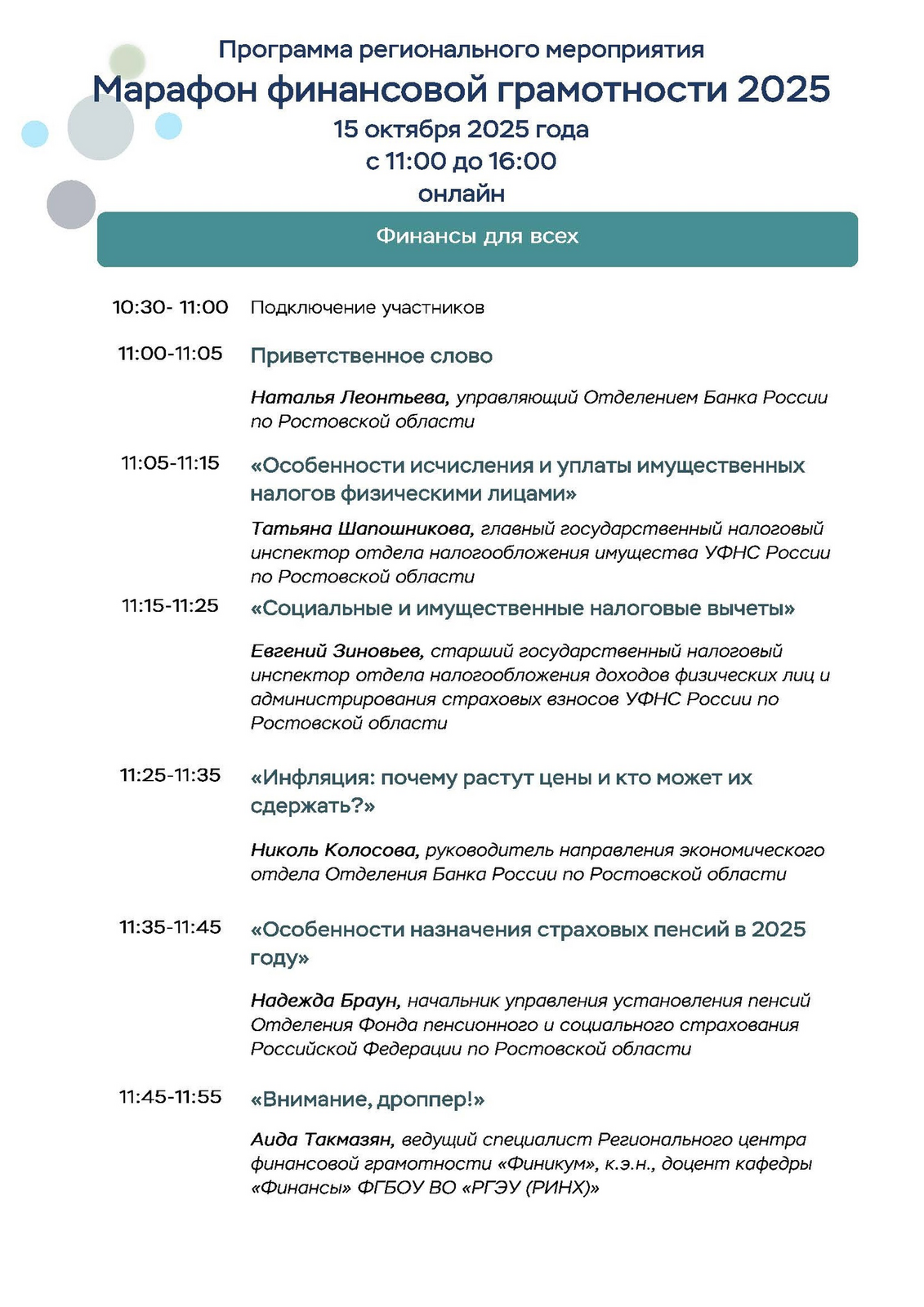 Участники «Марафона финансовой грамотности-2025» узнают, как составить личный финансовый план, получить налоговые вычеты, как формируется пенсия. Эксперты разберут реальные кейсы противодействия кибермошенникам и защиты прав на финансовом рынке, а в блоке для бизнеса расскажут, как успешно развивать свое дело, правильно выбрать банковские продукты, как решать вопросы налогообложения, познакомят с преимуществами Системы быстрых платежей в расчетах.